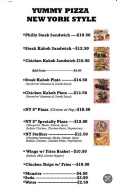 Our menu at Yummy Pizza also includes a range of other tasty items like wings with fries, chicken strips, gyros, Philly steak, chicken kabab, chicken parmjean sandwich.all made with fresh ingredients. Whether you're catching us at a local festival in the Near by neighborhood or a private party. Yummy Pizza trucks delivers a memorable dining experience that showcases the best of food trucks.